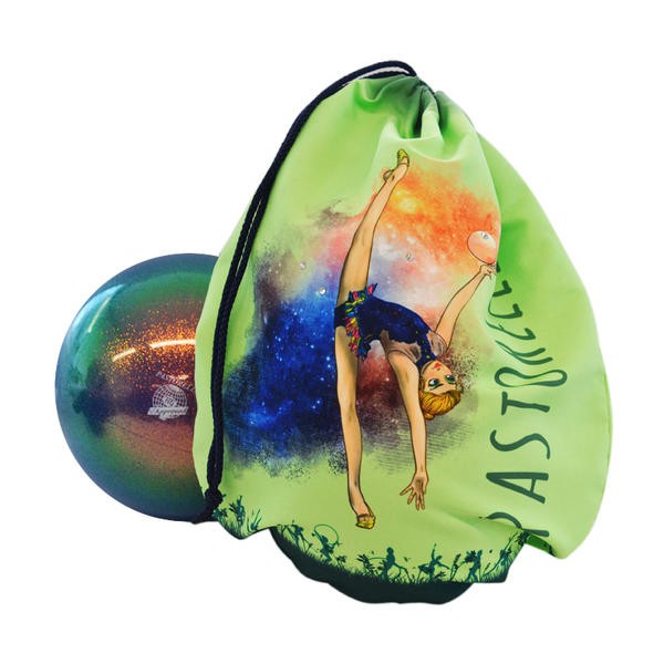 Estampada con una gimnasta con la pelota emergiendo de un fondo de varios colores.