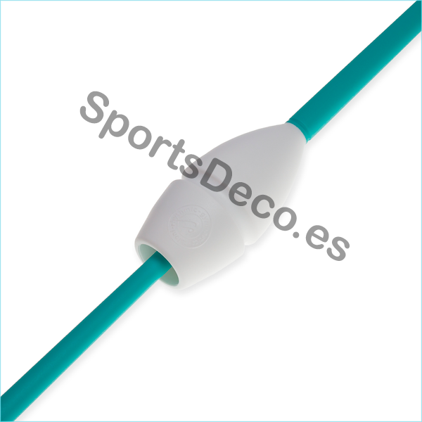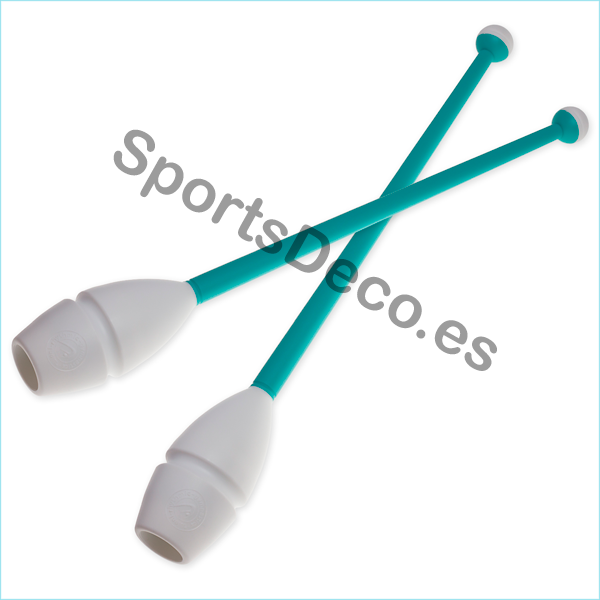 Mazas de goma bicolor engarzable para gimnasia rítmica. Cabeza de caucho (Blanco) y palo de plástico (Aguamarina).