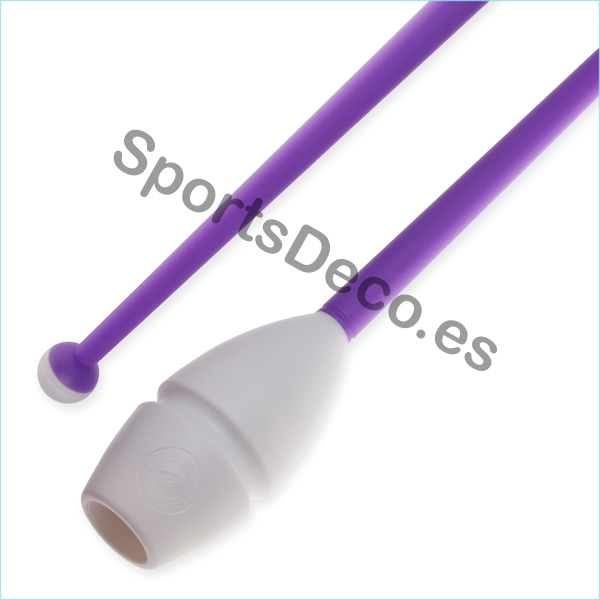 Mazas de goma bicolor engarzable para gimnasia rítmica. Cabeza de caucho (Blanco) y palo de plástico (Violeta).