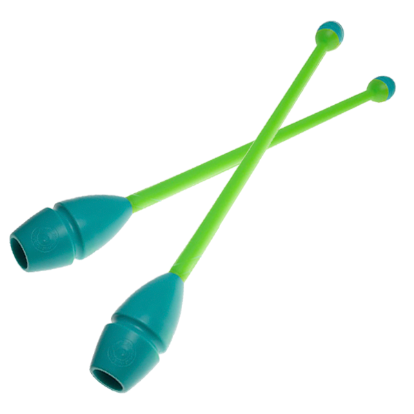 Mazas de goma bicolor engarzable para gimnasia rítmica. Cabeza de caucho (Turquesa) y palo de plástico (Amarillo).
