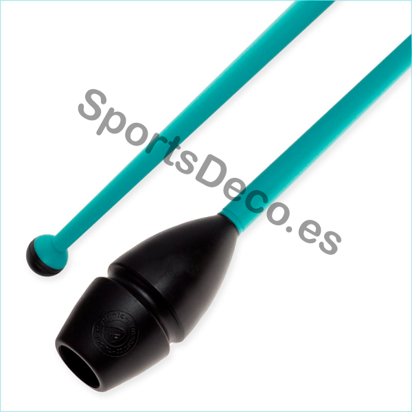 Mazas de goma bicolor engarzable para gimnasia rítmica. Cabeza de caucho (Aguamarina) y palo de plástico (Negro).